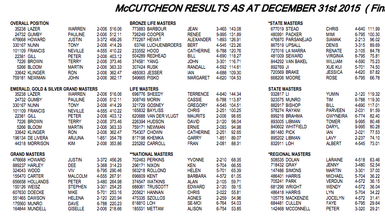 Congratulations to Yvonne Perkins who won the final of the McCutcheon ranking award in 2015 as a National Master **. This is the accumulation of master points won throughout the year.  It is an excellent result.  Jennifer Ardill also did well to come 7th as a Local Master * and Colin Dempster 10th as a Regional Master.