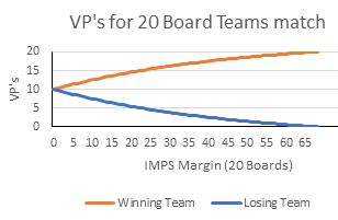 Near the extreme, if Team A scores 70 Imps and Team B 5 IMPs (difference = 65), then Team A would be awarded 19.86 VPs and poor old Team B gets the dregs: 0.14 VPs.